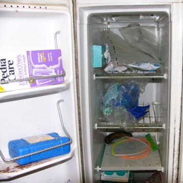 The freezer compartment, almost emptied out the night before. We never did find out whether freezing those glow sticks makes it so they can light up again.